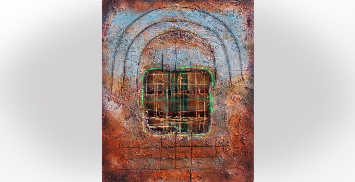 stucco, incisioni su stucco, uniposca verde, sacco e fili di iuta, acrilici, su tela