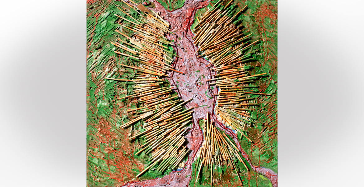 I graffi, i bamboo spinosi e diretti verso il centro suggeriscono un momento drammatico come può essere appunto, suggerito anche dal titolo, una frattura. La superficie verde interrotta da dei canali, conferma quanto appena detto. In questo quadro il tema della scissione si manifesta come un’esplosione violenta che provoca energia liberatasi nello spazio. Una frattura e simili esistono nel momento in cui si raggiunge l’apice di una forza che sprigionandosi riesce comunque a creare nuove realtà.