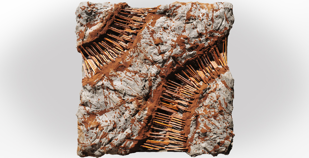 Questo lavoro è fortemente materico, quasi scultoreo. Lo spessore delle insenature oblique che attraversano la superficie, rende vibrante il risultato. I bamboo disposti uno accanto all'altro e intersecati, amplificano l'effetto di un movimento immaginifico: di una `struttura` unica come un filamento di DNA nel suo micro spazio. Il concetto di `atavico` è suggerito dalla massa grigia come una roccia e dalla terra. Entrambi antichi quanto l'età del nostro pianeta, elementi atavici che trasmettono sensazioni primordiali.